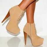 The real hit was the lace model. Beautiful cream-colored couples with high heels are divided into a boat and a designer insert with slits in front. Textiles are edged with a thin leather lace. The accent of these ankle boots are bows from a cord with hearts. Floral print lace makes the style of fragility and airiness.