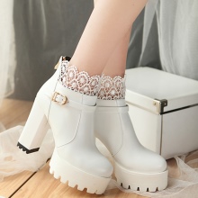 A variation of the series on the platform are models that combine the platform and the thick heel. They are often decorated with buckles and rhinestones. Light hits look the most advantageous. Snow-white leather ankle boots with a high back and golden buckles are decorated with lace print on the top. An ensemble with such couples will have a special premium status.