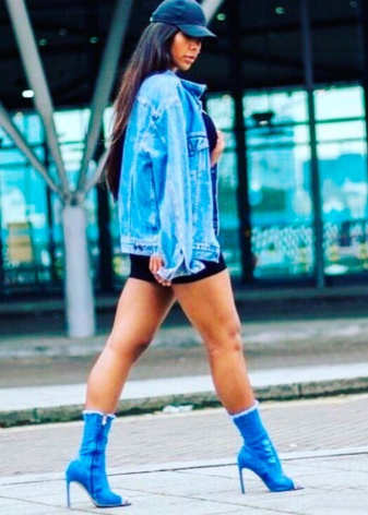 Denim bow prefers half-open and open styles of shoes. It can be not only with free fingers or a heel, but also open areas on the sides.
