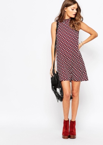 A cocktail look or bow for an informal party consists of low-heeled shoes and a retro-style dress.