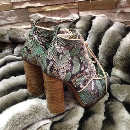 Platform and thick-heeled shoes feature lacing and a python print. Lacing adjusts the width of the shaft and is an element of decor, diluting the laconic form. A wide heel can be of different heights. Especially popular are trends with a small heel.