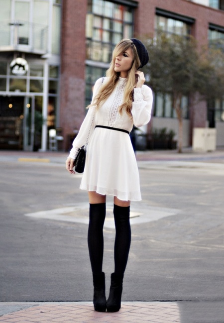The current hit, which brave women of fashion can boast, can be made up of trends in wide heels, short dresses and high golfs.