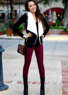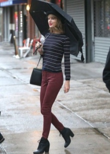 The top for lace-up ankle boots can be a shirt or cardigan, a trench coat and a bright raincoat. A plum, red or burgundy cloak is quite suitable.