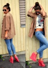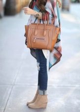 A combination of wedge heels with a tractor sole and a free poncho or cape with jeans and a felt hat will be interesting and stylish. This kit will be ideal for long spring walks.