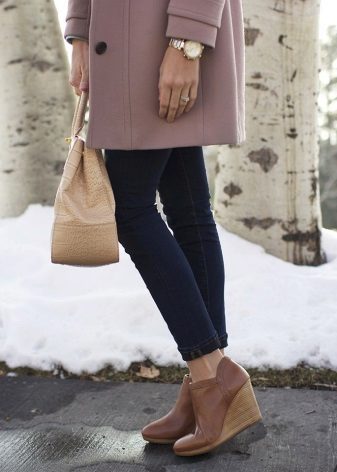 The options for wearing ankle boots are very diverse. We can say that this is a universal shoe, among which every fashionista will be able to choose a suitable model. Laconic style wedge ankle boots go well with a coat. At the same time, it is best to choose pants with a tight or semi-tight silhouette, then this will visually increase the length of the legs and make you slimmer. For a coat in combination with a skirt, it is best to choose tights to match the ankle boots.