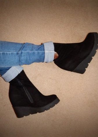 If you set a goal and pick up ankle boots with a high wedge made of foam rubber, wood or rubber, not tightened with leather or suede, then such models will be as easy to care for and will last more than one season, maintaining their original appearance.