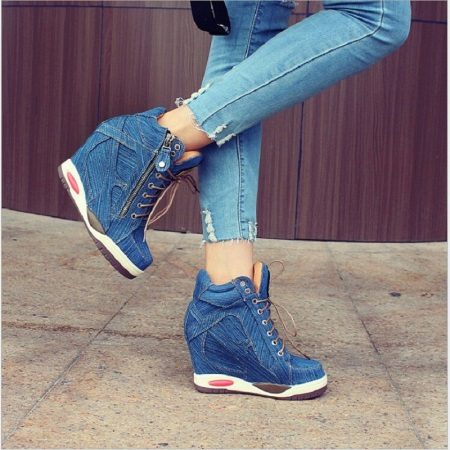 Denim ankle boots are summer models. Designers use curly cuts, make the toe or heel open. Often these models of ankle boots have a rich or even artsy decor of beads, rhinestones, lace and stripes. This season, models made from scuffed jeans or “boiled sweatshirts” are relevant.