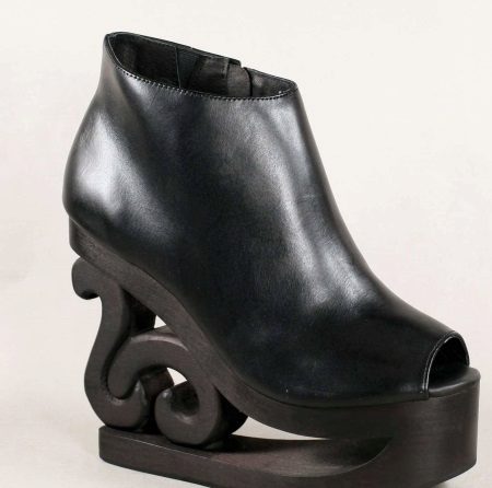 Fantastic ankle boots from Jeffrey Campbell also attract attention: an ornate detail instead of a laconic deaf wedge heel makes the boots look more like a work of an architect or sculptor than a fashion designer.