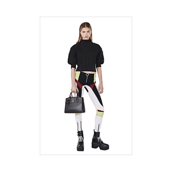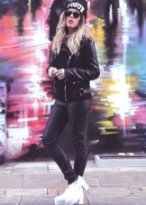 Ankle boots on a tractor platform with contrasting laces in combination with bright print leggings create an image on the verge of kitsch. A voluminous cropped black jumper and a classic black bag balance the silhouette and serve as a base for bright accents.