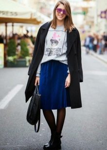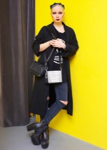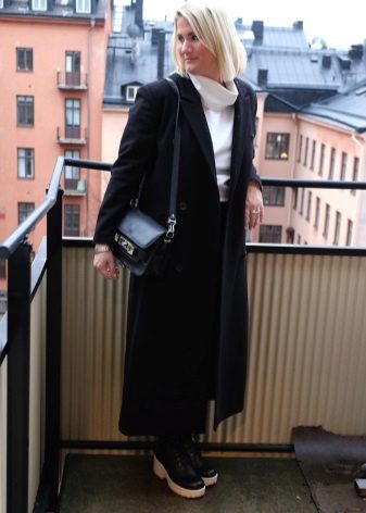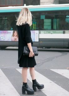 - Black ankle boots with a black skirt to the middle of the knee and transparent tights will make it possible to focus on rough shoes.