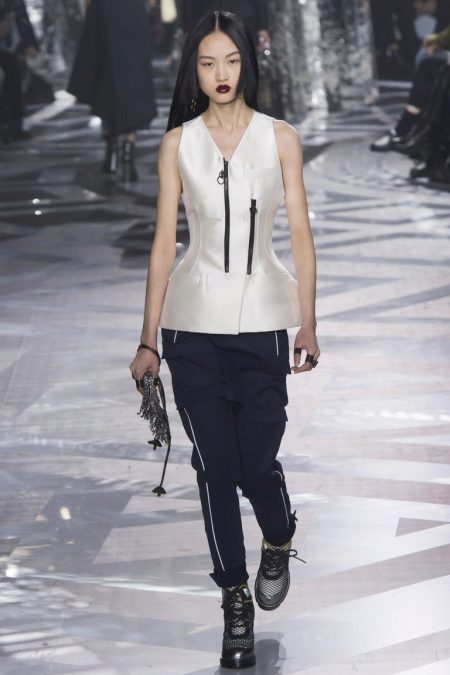 The bold ankle boots on the embossed platform are decorated with rivets, rubber inserts and straps. They take the function of emphasis on themselves. Their combination with a laconic suit in a black and white stripes looks complicated, but at the same time bright and bold. The image of the model is completed by a trendy licked styling and a rigid rectangular bag.
