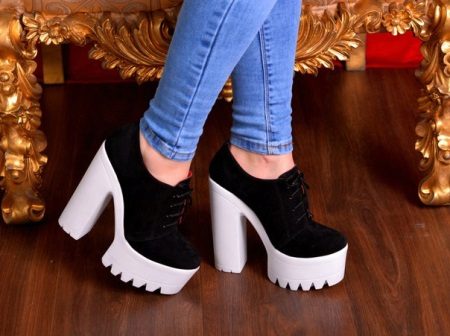 - Tractor-soled boots with high heels in milk or white are perfect to balance pastel shades. Their combination with light outerwear tone-on-tone and dark trousers looks especially successful.