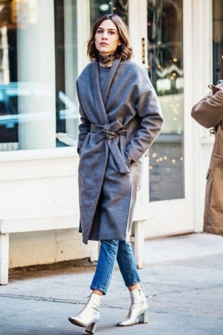 - Finish off this look with silver metallic shoes and a gray feminine coat and cropped blue skinny jeans. Having tied a light scarf with a print around your neck, you create an amazing spring look.