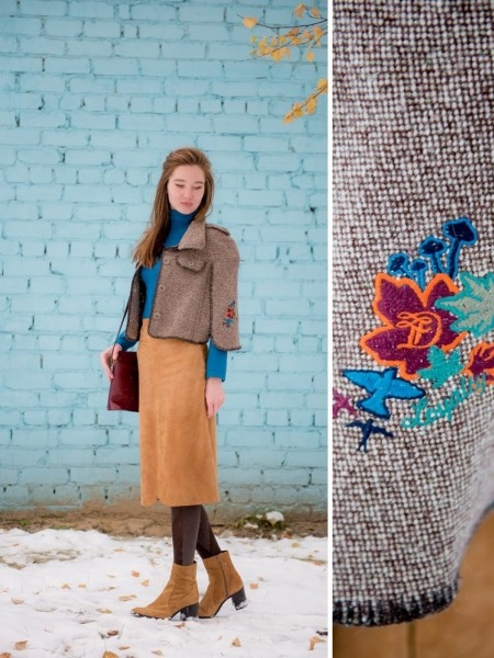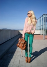 Green elements in combination with red ankle boots serve as contrast. The green thing should be only one, excess in this case is useless.