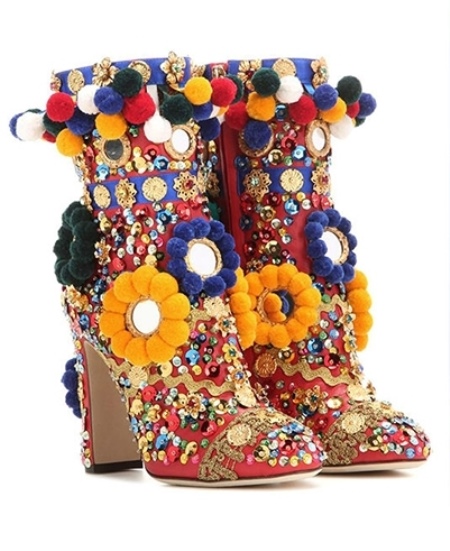 - The most original ankle boots are presented by Dolce & Gabbana. They are richly decorated with bright, multi-colored artificial flowers, stones and sequins.