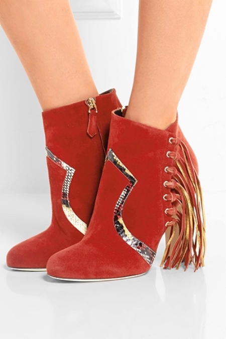 - Burberry Prorsum Suede Ankle Boots feature fringe.