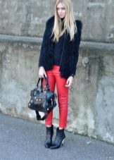 Red ankle boots require the presence in the image of the element in the same color. It can be a scarf, bag, jacket, coat. As accompanying colors, clothes in blue, green, white, red and black can appear. It is acceptable to combine red ankle boots with checkered clothing.