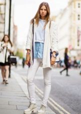 Models with a tractor sole you can safely wear with tight trousers, dark jeans with scuffs or torn knees. In such images, the upper part should be more voluminous, for example, a boyfriend’s shirt or sweatshirt.