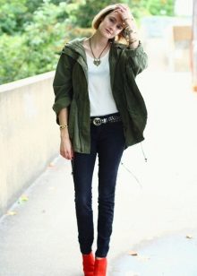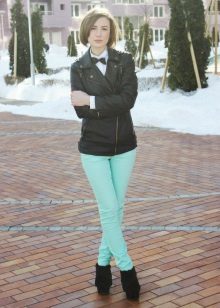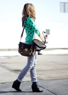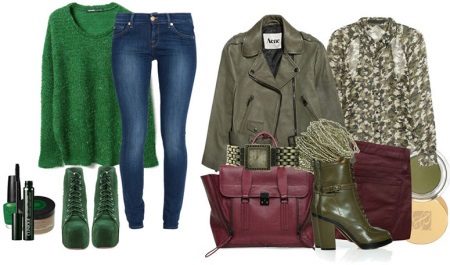 Under green ankle boots, you need to choose clothes in warm and cold shades. If the shoes have lacing, you can safely put on tight blue jeans. For a bold look, you can add a red or pink element of clothing of a simple style.