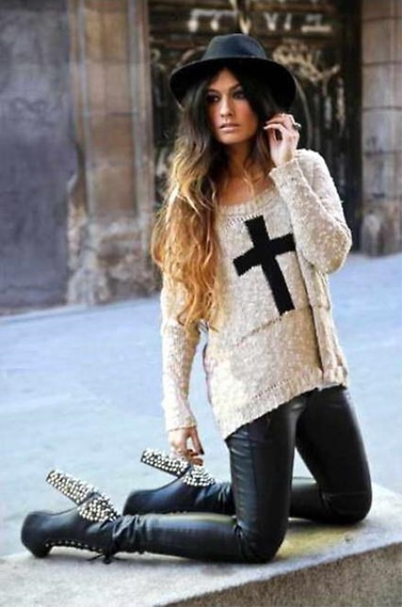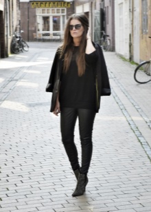 - Go for a party or rock concert with thick heeled ankle boots combined with black leather leggings and a tight tunic. Instead, you can wear a top with a vest, and replace leggings with velvet trousers, which make the figure slimmer.