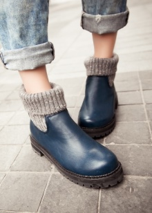 In the cold season, blue ankle boots with leggings or tight trousers will look great. Ankle boots with a wide top or assembled “in accordion” are best suited. They can be on a small heel, can be flat soles or wedges.