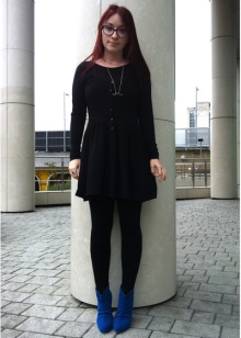 And the last nuance, you can wear tights to match the ankle boots, in our case - blue, this will visually lengthen the legs, and also make them slimmer.