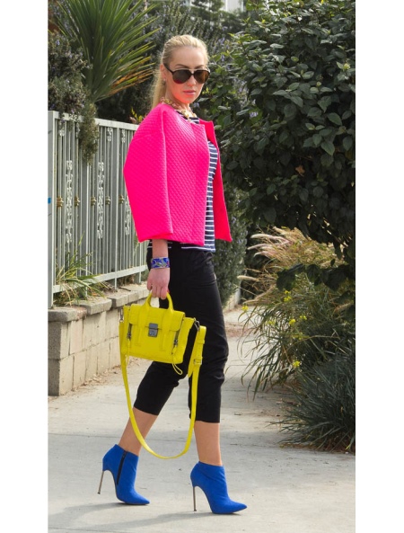 If you nevertheless decided that only blue will prevail in your outfit, then we select the color for ankle boots - a bag. Accordingly, other clothing and accessories should not attract attention.