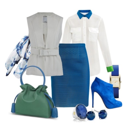 Or, for example, a skirt on the palm above the knee in white and a blouse in the color of ankle boots.