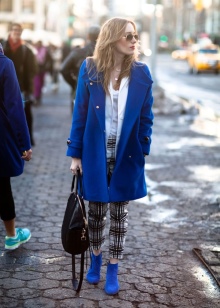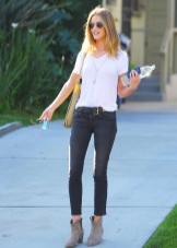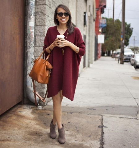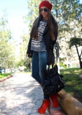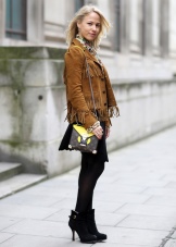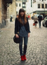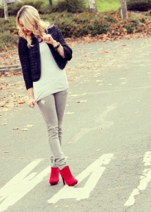 You can make a bright accent in the image with color ankle boots. To do this, it is enough to choose the restrained colors of clothes, and jewelry to match the tone of bright shoes. By the way, there is one trick in the selection of jewelry: suede texture looks noble and expensive in combination with gold accessories. They shade and emphasize the matte surface of the shoe.