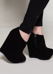 For a special occasion, ankle boots on a thin high wedge, which can have an unusual shape or finish, are suitable. For example, this season, designers are experimenting with decorating wedges, using sculpting, unusual fittings for this purpose, or applying various images to it.