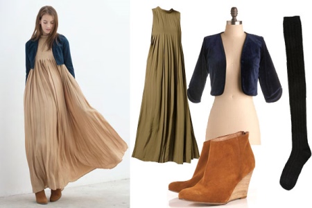 To create a bohemian-chic look, combine suede boots with a chiffon flowing floor-length dress, throwing on top a jacket, a light parka, or short fur coat.