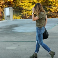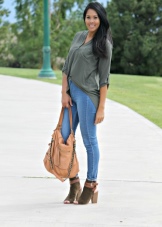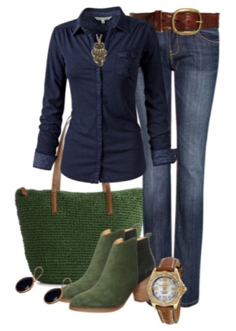 - Blue color is adjacent to green in the color range, this allows you to combine green ankle boots and blue things without restrictions. The most basic option is blue jeans and ankle boots in green. In a strict manner, jeans can be replaced with trousers or a skirt that will not cover your knees. In tone to shoes, you can and even need to add accessories. The right decision would be to buy along with shoes and a bag in the same color.