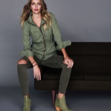 - Military style is embodied in olive or khaki boots. What to wear such shoes with? Do not wear camouflage so that the image matches the chosen style? Under such original shoes you can wear jeans or denim shorts, a white T-shirt or your favorite T-shirt. A colorful print skirt can also be a great option.