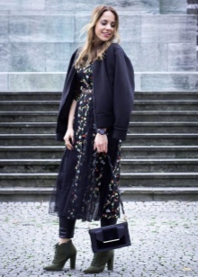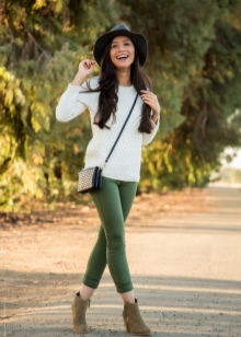 - Dark green ankle boots can be worn under black items. In this case, the image will be strict. White, beige or blue top will help to dilute its gloom.