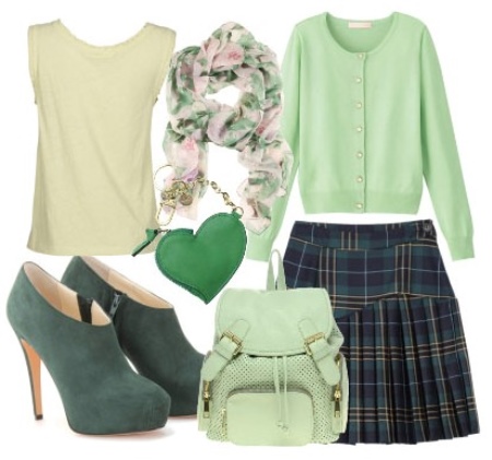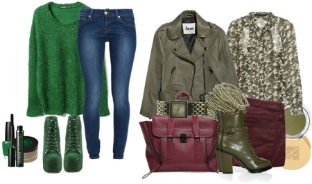 Under green ankle boots, you can pick up clothes in warm and cold shades.