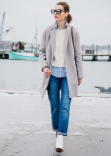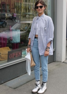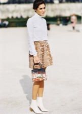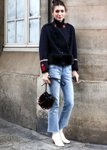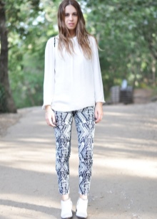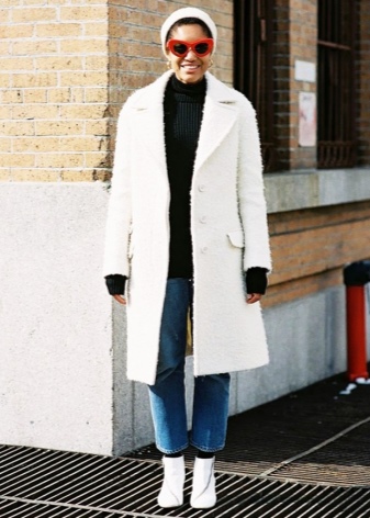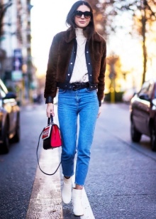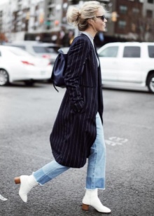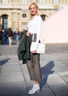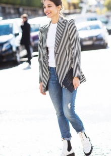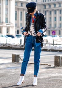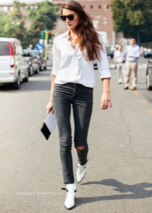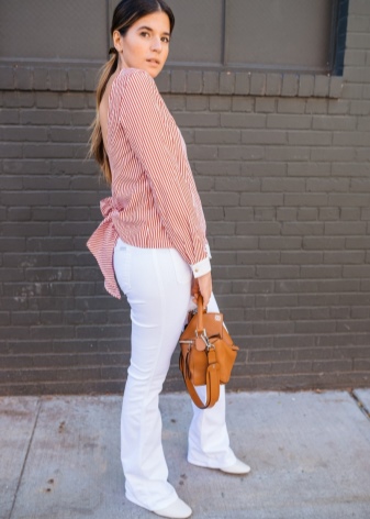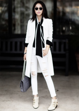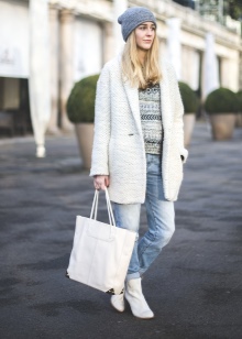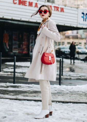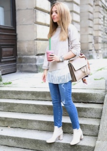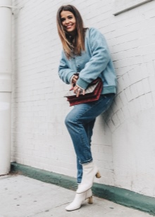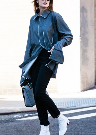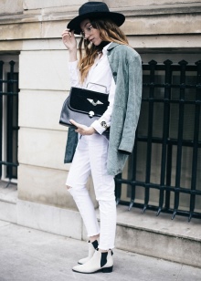 The most stylish and original image can be obtained by finding the right combination of white boots with jeans. For low girls, stylists recommend combining such shoes with a light bottom of a tight-fitting or straight cut at a high waist. Mid-rise and low-rise jeans are suitable for tall women. As the top in this case, it is worth choosing monophonic things: loose t-shirts, tight turtlenecks, crop tops or translucent blouses.