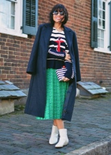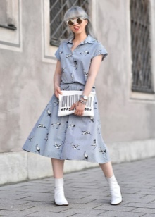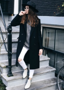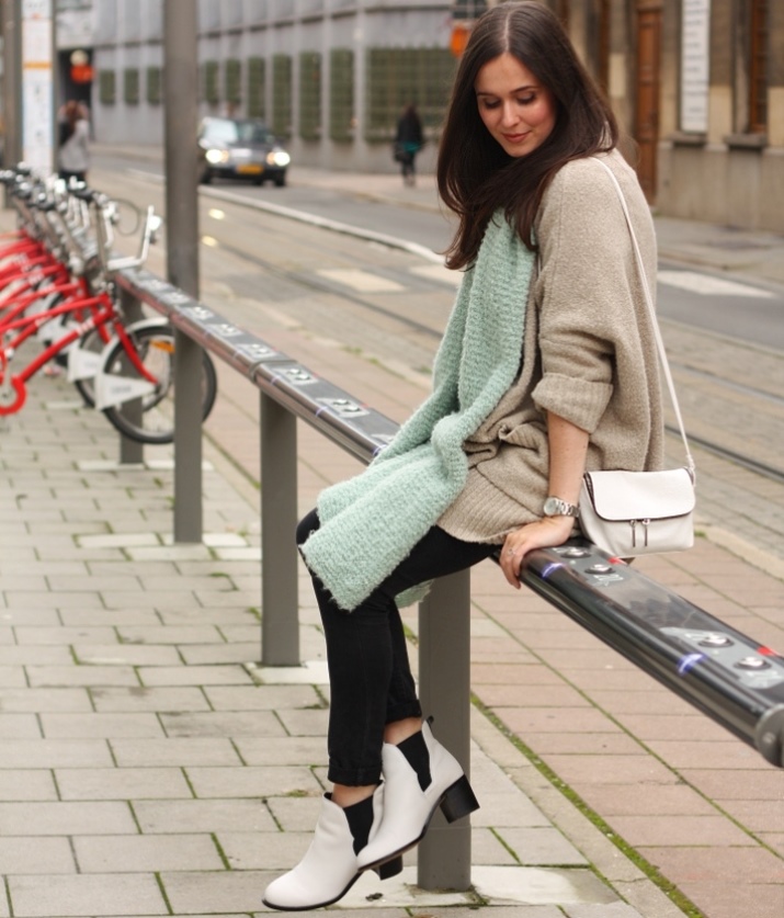 A more casual look can be created with Chelsea-style heeled boots and a midi-length knit dress. It can be a simple cut, neutral gray or pale green. A similar image should be complemented with sunglasses with a white frame or a light bag of small size.