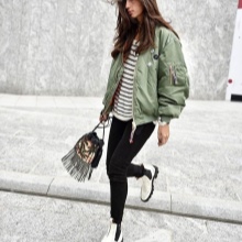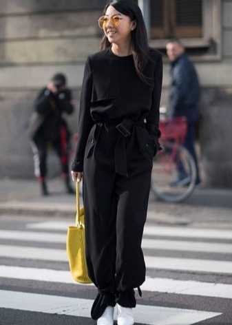 A more elegant style can be created with bright-colored trousers, tapered down. The top in this case is better to choose black and loose cut. In such a bow, an accessory of a light shade must also be present.