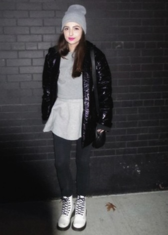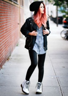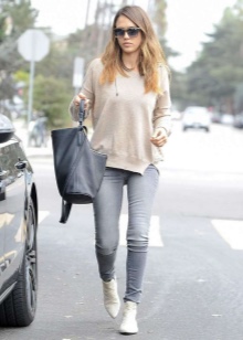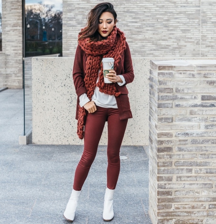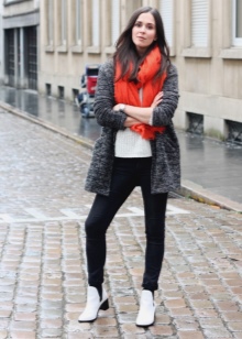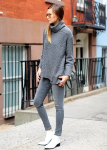 The combination of boots with leggings is a favorite autumn option for thin people. As a top, voluminous knitted sweaters with a neck of soft colors will look extremely stylish.