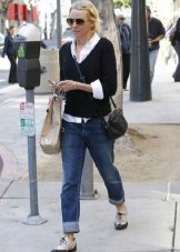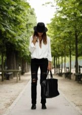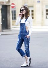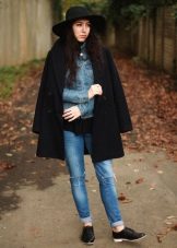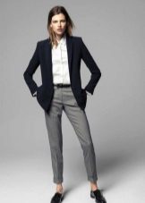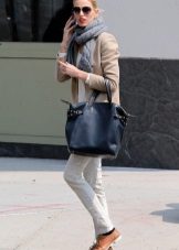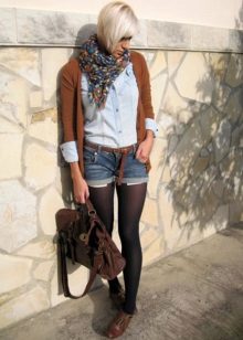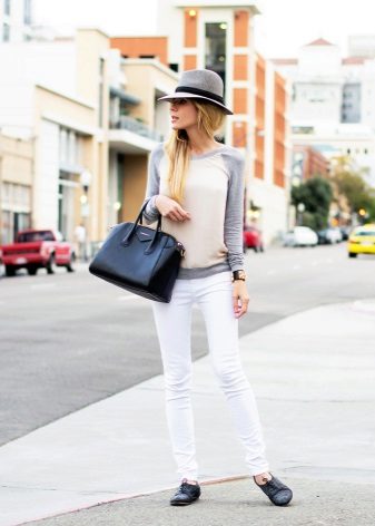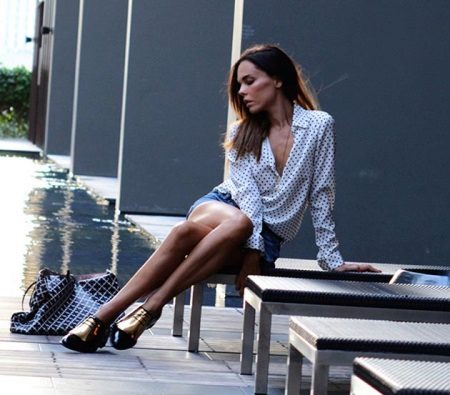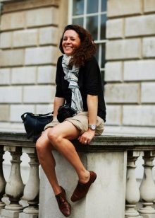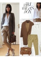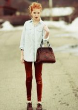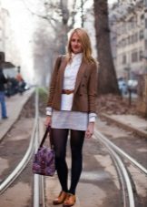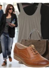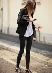- Beige brogues with a dark shade, combined with dark blue skinny and the same color jacket, harmoniously blend in with the casual casual style. The jacket is classic, shortened, with folded sleeves.A neutral blouse of a free cut of a light shade is selected under the jacket - white, without decor and to the length of the waist. A dark brown bag in the same tinted row as brogues with a shoulder strap completes the look. Makeup is accented on bright red lips. A practical tail and dark glasses give the image a severity and at the same time immediacy. From jewelry, a thin metal bracelet on the wrist is selected.