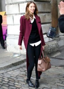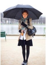 - Dark brown brogues with contrasting beige stitching between the sole and the upper part of the shoe in combination with an elongated coat jacket will give an image of a stylish urban girl in the cool off-season. Double-breasted coat of peach color, matching shade with brogues. A long sleeve, a turn-down collar, mortise pockets emphasize the practicality of the coat model. Under the coat, beige skinny pants to the ankles with trim on the bottom and sides of the leg look contrasting with dark buttons. These trousers are combined with a light and concise blouse, t-shirt or longsleeve in the same color scheme. Black socks or stockings, visible between trousers and brogues, perfectly complete the look. In this form, you can make walks around the city, go to school, to meet with friends, shopping.