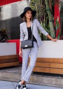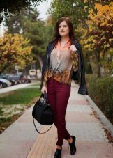 - This image is the embodiment of a city socialite, sophisticated and stylish. To the brogues of brown-red color, loose pink trousers are selected, slightly narrowed downwards with tucked up trousers. A short white tank top or top emphasizes the waist line and blends harmoniously with the brown strap on the trousers. On top of the T-shirt is a stylish, shortened jacket of a plum-colored juicy color with a long sleeve and a cuff at the waist. The turn-down shirt collar echoes the severity of the brogues. Short socks in the same color scheme emphasize the color scheme of the image, focus on brogues. The headgear in the form of a stylish man's hat of dark color, sunglasses and a bulk bag a tone darker than brogs complete the image. Makeup is made with emphasis on bright lips with red lipstick, hair loose on the side. In this way it is appropriate to go to exhibitions, walks, meetings.