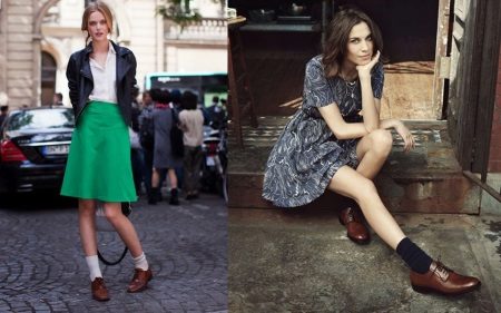 Straight-cut dresses, or a-line, free-cut dresses - almost any combination with brogues, except for maxi length. A short dress would be ideal. Femininity and elegance will give the image of brogues in combination with a skirt or midi-length dress.