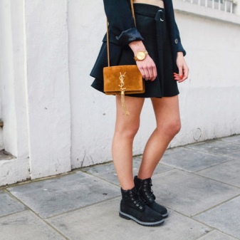 Timberland boots have been at their peak for more than a year. Reds are still considered classic, but blacks are more versatile and practical. You can wear them all with the same plaid shirt, skinny jeans, a jacket-jackets, and you can try to combine with a light airy dress.