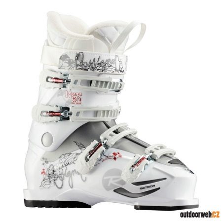 Rossignol Kelia 50. This model is for women. Hardness 50. The width of the pads 104 mm. Very light in comparison with boots of other brands with the same characteristics. Easy to remove and put on, while perfectly fixing the leg. They have three metal clips.