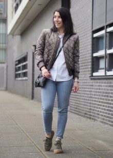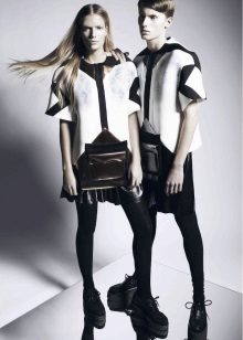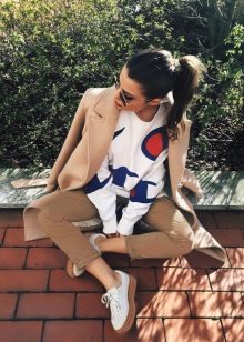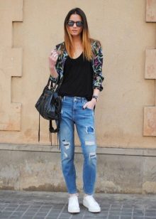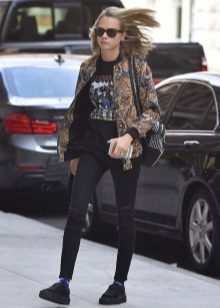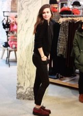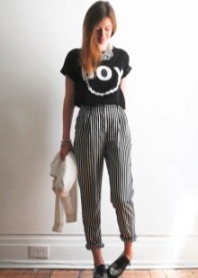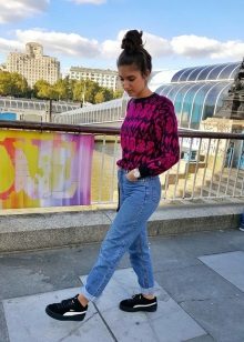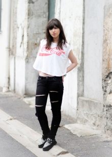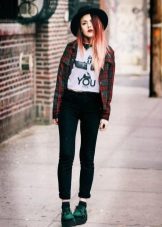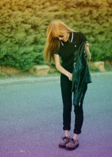 The first thing that comes to mind is narrowed pants or jeans, because such a combination can be called classic. It is advisable that the trousers do not reach your ankles, like the founders of the style - teddy fights. You can also try wearing them with torn boyfriends or overalls - you get a modern, stylish combination.