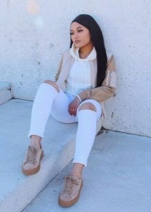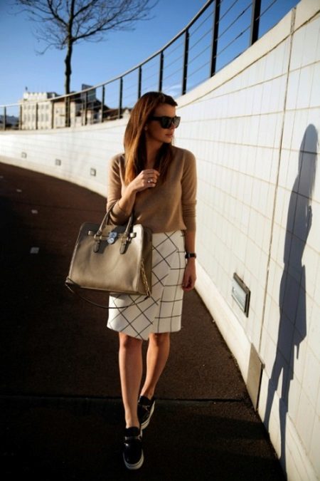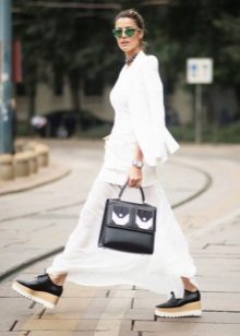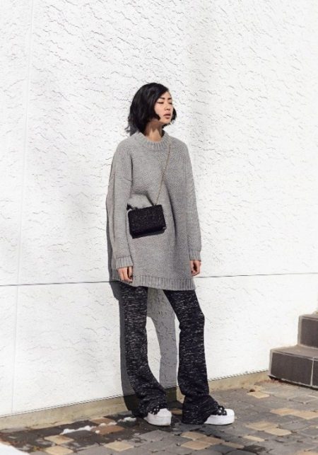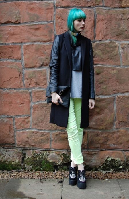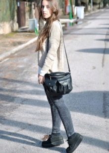 - Creepers are traditionally worn with skinny and cropped trousers, but why not give preference to a more interesting combination? White creeps will look great with slightly flared melange joggers and a stretched gray sweater. The look will be complemented by a small handbag on the shoulder - now such models are at the peak of popularity.