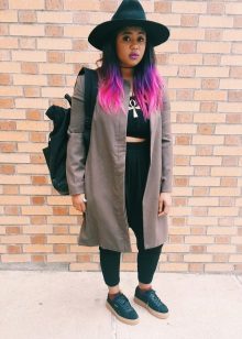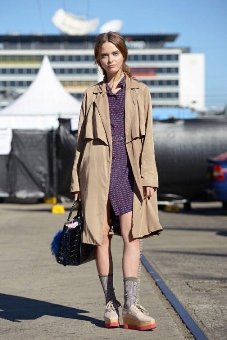- Going on a date? Put on a light amethyst shirt-dress, high socks with metallic thread, pastel-colored thick-soled creepers and toss a light trench coat on top. The roomy black bag, which can be replaced with a small clutch, will complement the look.
