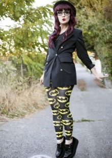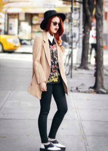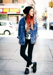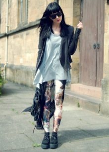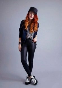 On slender girls, leggings in combination with creepers look great. Regardless of your physique, it is better to wear them with an elongated top. It can be a tunic, an elongated shirt, a jumper, a sweatshirt. If you want to wear a short top, combine it with a long jacket or cardigan.