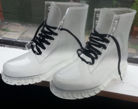 Transparent berets are made of vulcanized rubber and provide them with a classic anti-slip sole. A kind, these are rubber boots, only on laces. They can be colorless, colored and with various prints. Look great with colorful socks and cropped jeans.